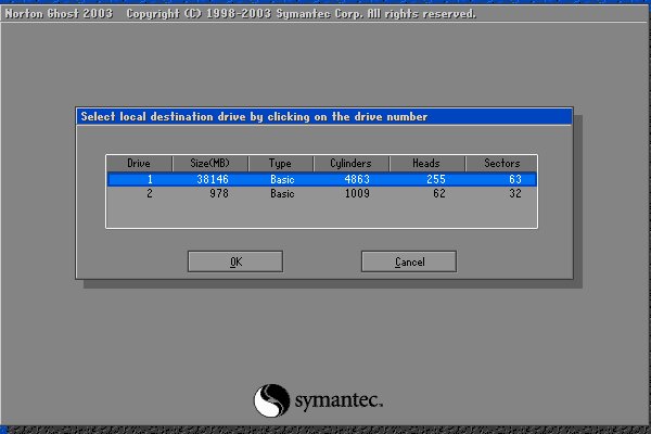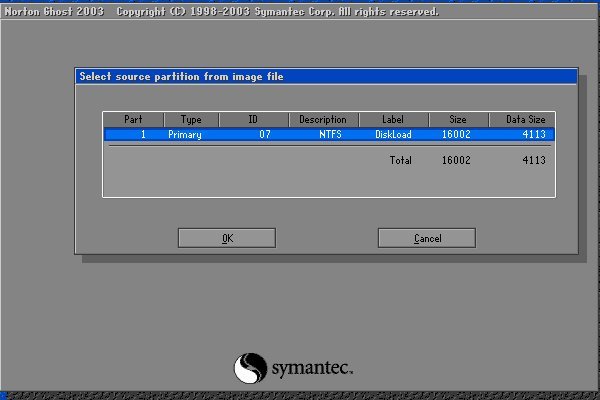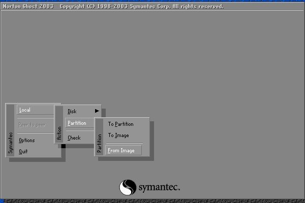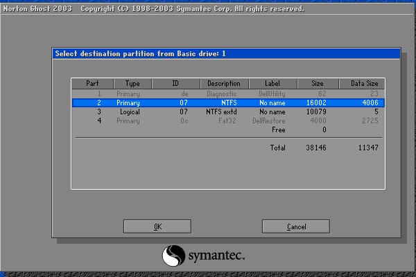 (Note: these screens show the Norton Ghost 2003 program. However, the Dell recover.exe program will look nearly identical to this.)