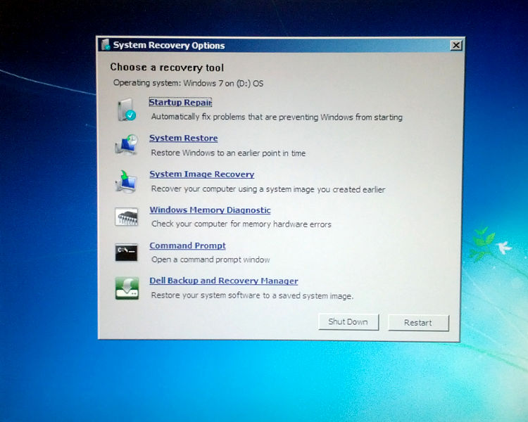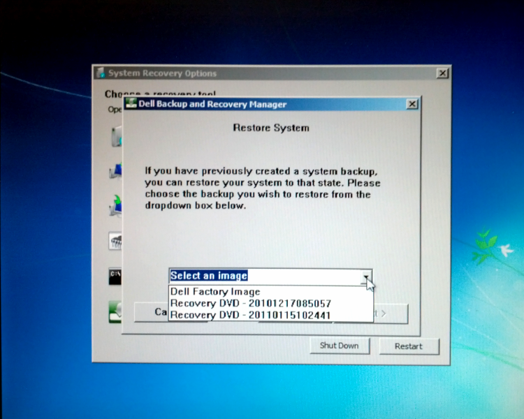 If you do not have a "Dell Backup and Recovery Manager" option, try a manual restore from the Dell Factory image.