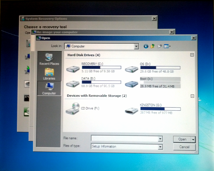 The following instructions assume the flash drive (as determined in screen 8) is drive G:, the Recovery partition is drive C:, the Windows-7 OS partition to be overwritten is D:.
