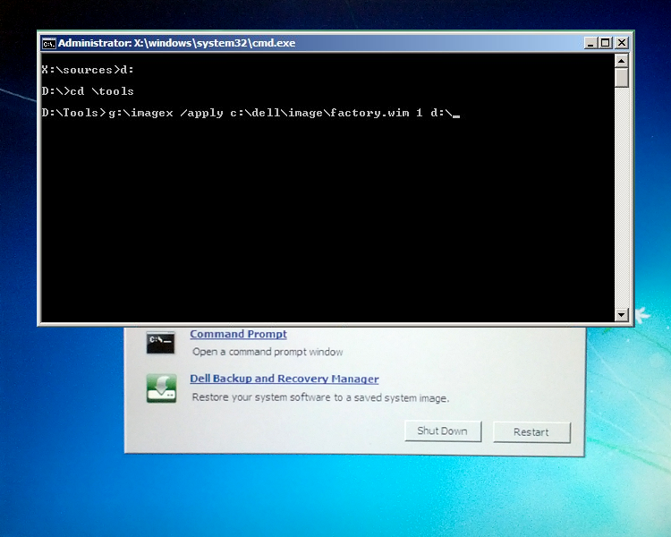 g:\imagex /apply c:\dell\image\factory.wim 1 d:\