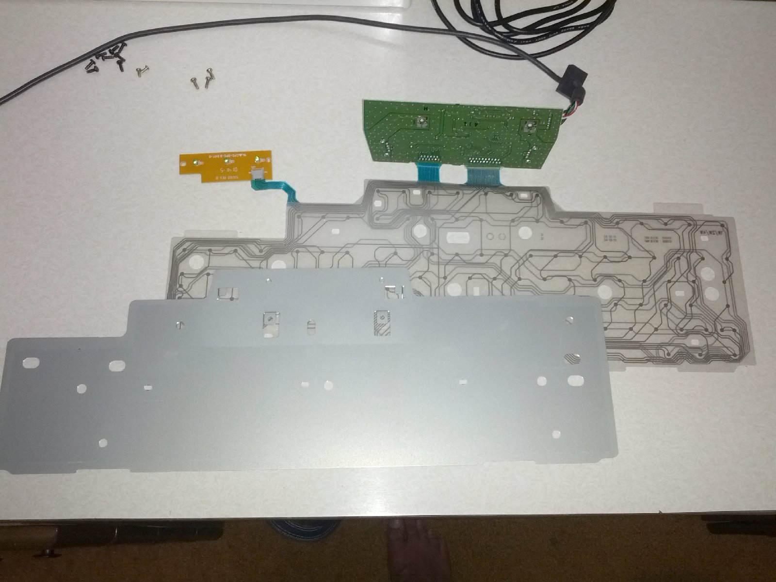 Then carefully remount the plastic circuit trace sheet and metal bottom plate, aligning them on the plastic guide posts.