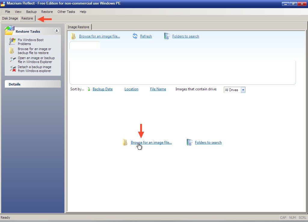 Boot from your Macrium Reflect Rescue media (CD or USB stick). Click the Restore tab, then click the link to browse for your backup image. Navigate to your backup image and select it.