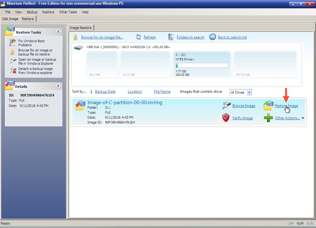 Once selected, the lower part of the right pane will list your image. To proceed, click the "Restore Image" link.