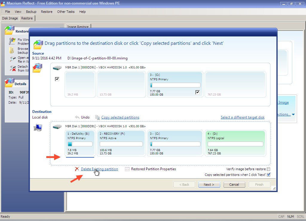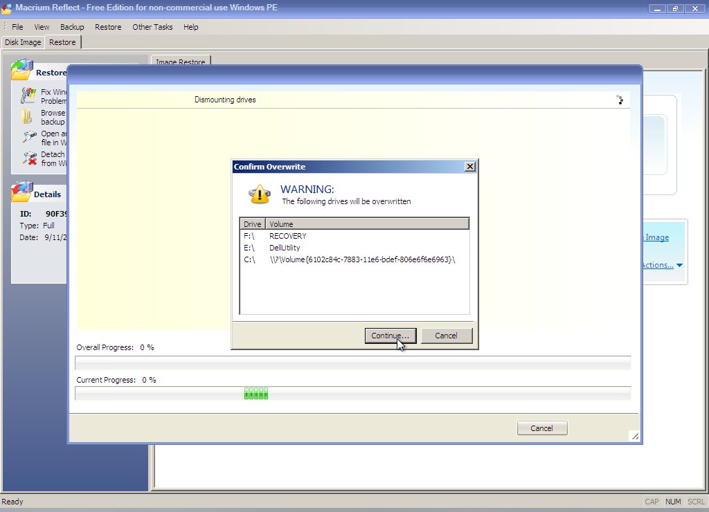 Click "Finish" and "Continue" on the next two screens. Note that Macrium will remind you the first three partitions will be overwritten.