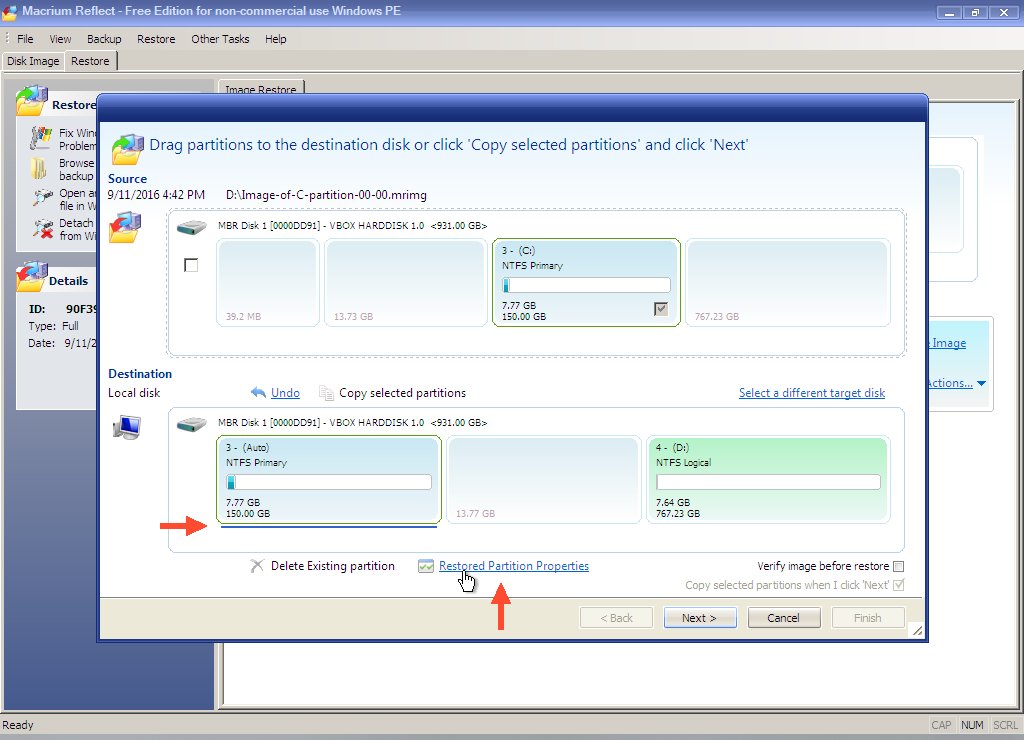 We want to expand the restored partition to use that space, so click the "Restored Partition Properties" link.