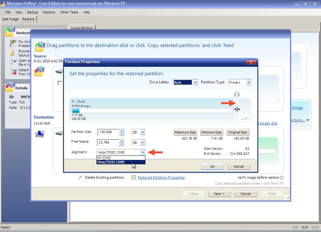 IMPORTANT: In the "Alignment" box, make sure you select "Vista/7/SSD" so Macrium properly aligns the partition when it is restored.