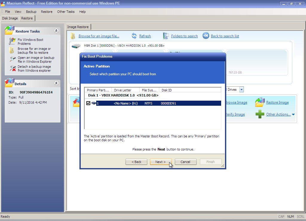 However, the boot configuration still needs to be repaired before the restored partition will boot properly.