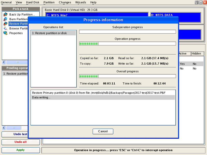 The Paragon program will begin writing the contents of the backup image onto the target partition.