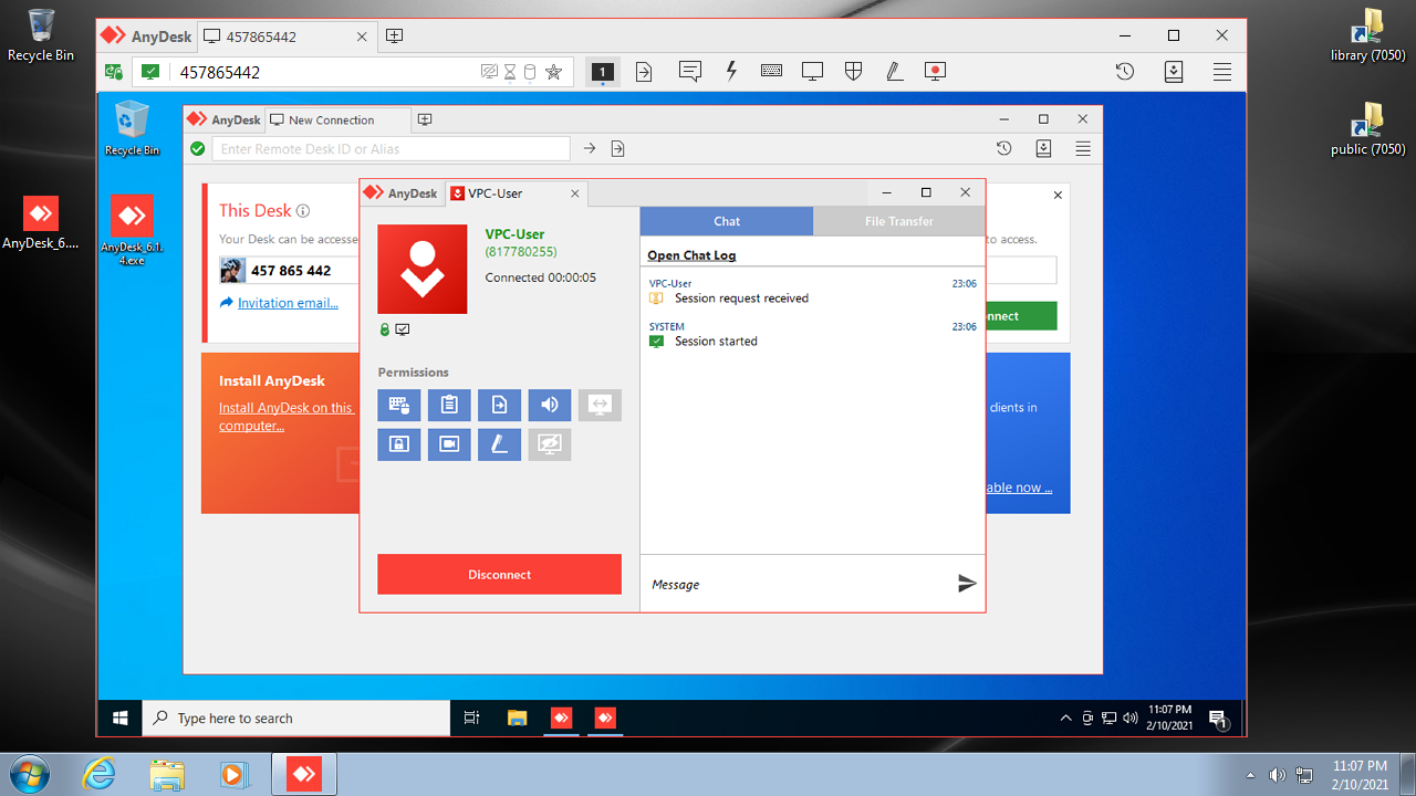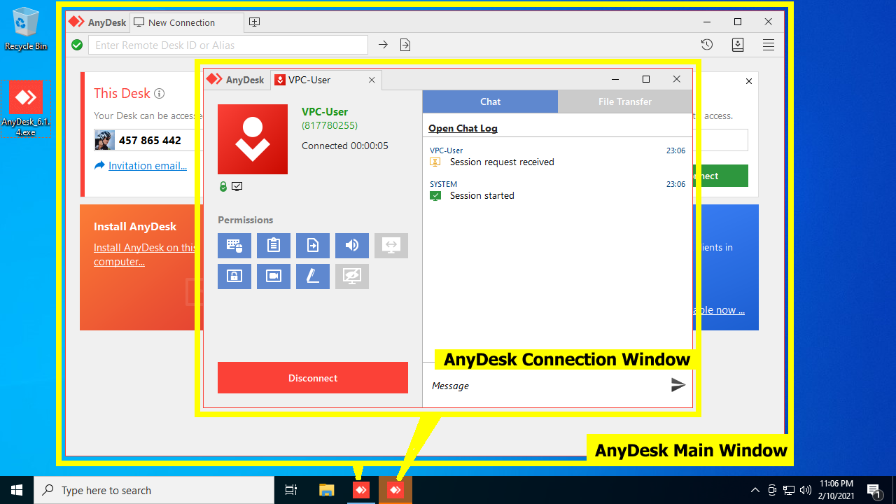 On Client's screen, Helper can see Client's AnyDesk main window and connection window.