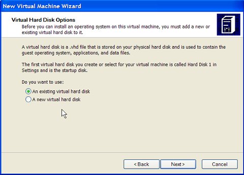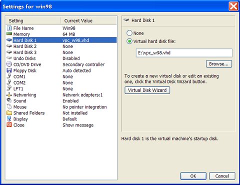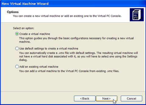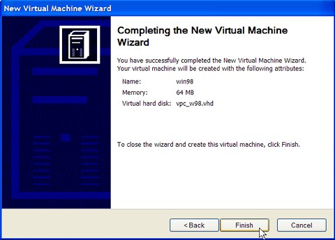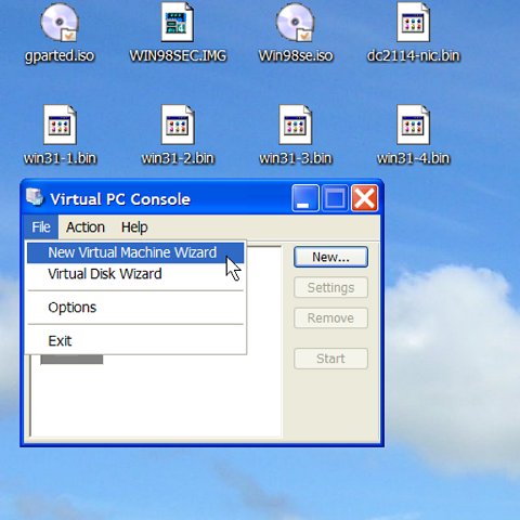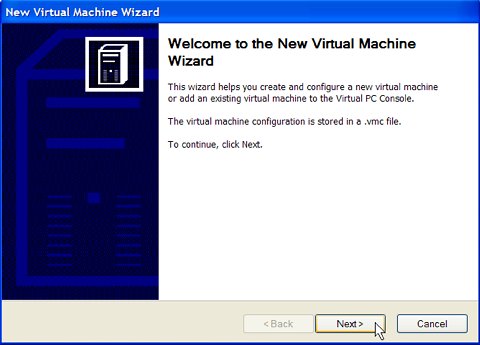 A "virtual machine" ("vm") is a file somewhere on your real hard disk. The Microsoft Virtual PC application will pretend this is a complete personal computer in itself. The virtual machine includes a virtual display adapter, a virtual floppy drive, and a virtual CD drive. You can attach one or more virtual hard disks to this virtual machine. This section illustrates how to create a virtual machine.