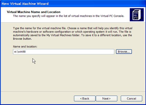The virtual machine will be a vmc file. This file can be located anywhere on the host system. By default, the vmc file will be stored in a "My Virtual Machines" subfolder under our "My Documents" folder. The vmc files are not as large as virtual disk files. Nevertheless, let's store the vmc files on the E: drive along with the vhd files.
