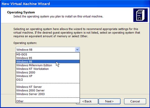 This step isn't critical, but by indicating here that we're going to install Windows 98 in this vm, the wizard will recommend a ram setting in the next step.