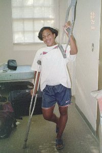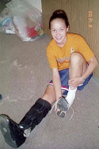 Hurt on the first day, Stephanie B. tries on her new boot . . . while Brandy tests out Stephanie's crutches.